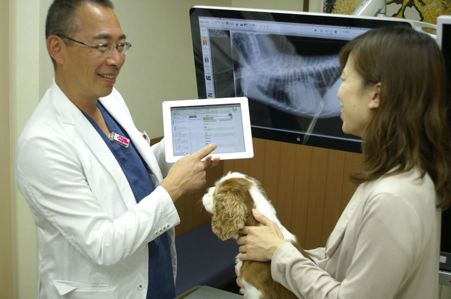 This service makes it possible for pet owners to check test results, dietary instructions and instructions for medications from their personal computer or smartphone. This can be used to accurately convey medical information to family members, or for all family members to be educated about a pet's medical situation and medical needs. It can also be used for two-way communication where a veterinarian follows up with the pet owner after treatment.
