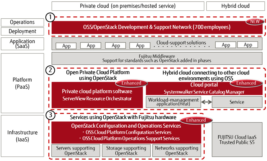Fujitsu has strengthened its OSS Cloud Platform Configuration Services that use Fujitsu hardware for OSS support, and in addition to support for Citrix CloudPlatform, Apache CloudStack, and Eucalyptus all of which are available in Japan, as well as SUSE Cloud in Germany, Operations Support Services have been made newly available to support Red Hat Enterprise Linux OpenStack Platform. These enhancements make it possible to build platform environments using OpenStack.